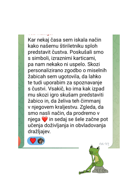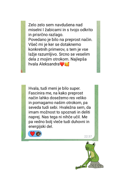 Miselne žabice so orodje, skozi katerega otrok prepozna svoje misli, občutke in notranje vzgibe. Predstavljajo jezne, žalostne, prestrašene, navihane ali ljubosumne notranje glasove, ki pogosto vodijo njegovo vedenje.